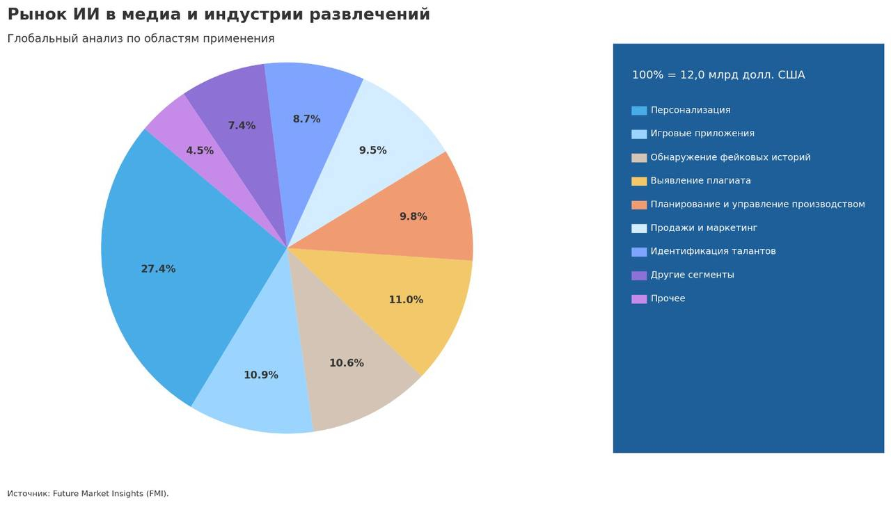 По данным ВЦИОМ и НЦРИИ, доля российских организаций, использующих ИИ, выросла с примерно 20% в 2021 году до 43% в 2024 году. Сфера медиа и коммуникаций также входит в число приоритетных для внедрения ИИ.