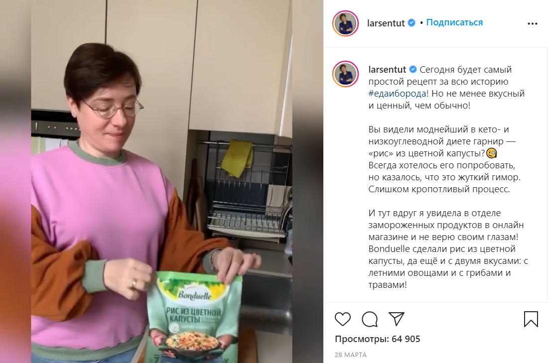 Так как рис из цветной капусты обладает большим количеством полезных свойств, то рассказывать о нем должны люди, так или иначе связанные со здоровым образом жизни. В результате для рекламной кампании в качестве охватных инфлюенсеров выбрали теле- и радиоведущую Тутту Ларсен и певицу Ёлку. Обе селебрити имеют аккаунты-миллионники и часто делятся с подписчиками контентом о здоровом образе жизни и питании.