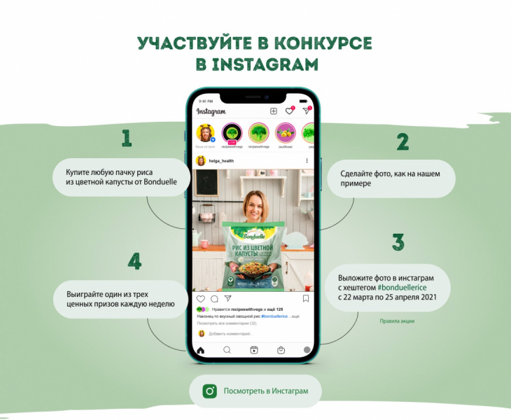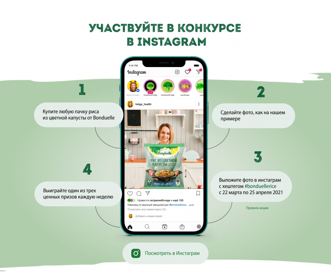 Помимо этого, к продвижению привлекли блогеров-экспертов по здоровому образу жизни и правильному питанию. Блогеры рассказывали о конкурсе #bonduellerice, который проходил в поддержку запуска в Инстаграм, чтобы привлечь аудиторию к новому продукту. Пользователям было необходимо «примерить» упаковку продукта, сделать фото и выложить на своей странице в Инстаграм.