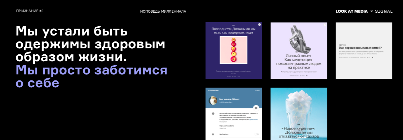 Однако поколение Y за эти годы изменилось — его представители начинают воспринимать организм и психику как единое целое. В спорте не обязательно добиваться высот: в бассейн можно пойти не для того, чтобы подготовиться к Ironman, а просто поплавать и расслабиться. На место ЗОЖ-гонки пришла забота о себе в разумных пределах. Миллениалы начинают подвергать сомнению некоторые практики: стоит ли делать сахар (или глютен) нашим лютым врагом? Нужна ли вообще палеодиета, или лучше перейти на интуитивное питание?