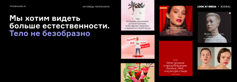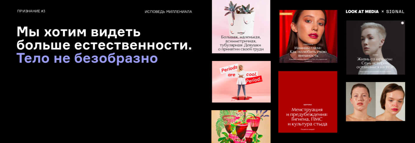 Миллениалы перестали отделять тело от психики, и с этим связан интерес к тому, как, в принципе, устроен организм. Если открыть любую онлайн-библиотеку, то в списках бестселлеров можно обнаружить книги «Очаровательный кишечник» или «Еда и мозг». Чем больше поколение Y узнает о физиологии, тем меньше видит в нем табуированные зоны. Тело не безобразно, и все, что происходит внутри — совершенно нормально. Раньше публичное обсуждение такой темы, как менструация, было невозможно себе представить. Поколение Y начинает отказываться от подобных табу и любить свою внешность, не стесняясь ни формы груди, ни шрамов.