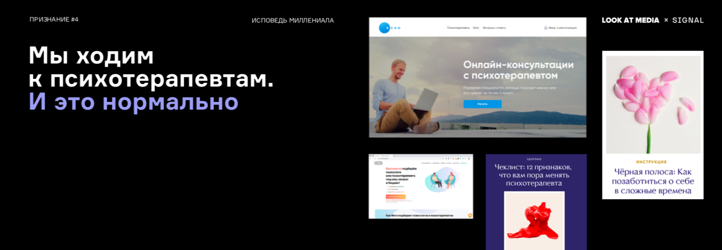 В отличие от большей части общества, миллениалы начинают открыто говорить о том, что пользуются услугами психотерапевтов. Поколение Y больше не задается вопросом, нормально ли «лечить голову» — это всего лишь часть заботы о себе, психологическая гигиена. Актуальным становится критерий выбора специалиста — как отличать психотерапевтов-профессионалов от шарлатанов.
