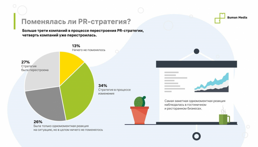 Большинство представителей PR-отрасли (61%) заявляет о том, что перестраивает или уже поменяло коммуникационную стратегию на фоне пандемии. У 26% участников была «одномоментная реакция» на ситуацию, но в целом ничего не поменялось. Самую заметную одномоментную реакцию эксперты отмечают в гостиничном и ресторанном секторах.