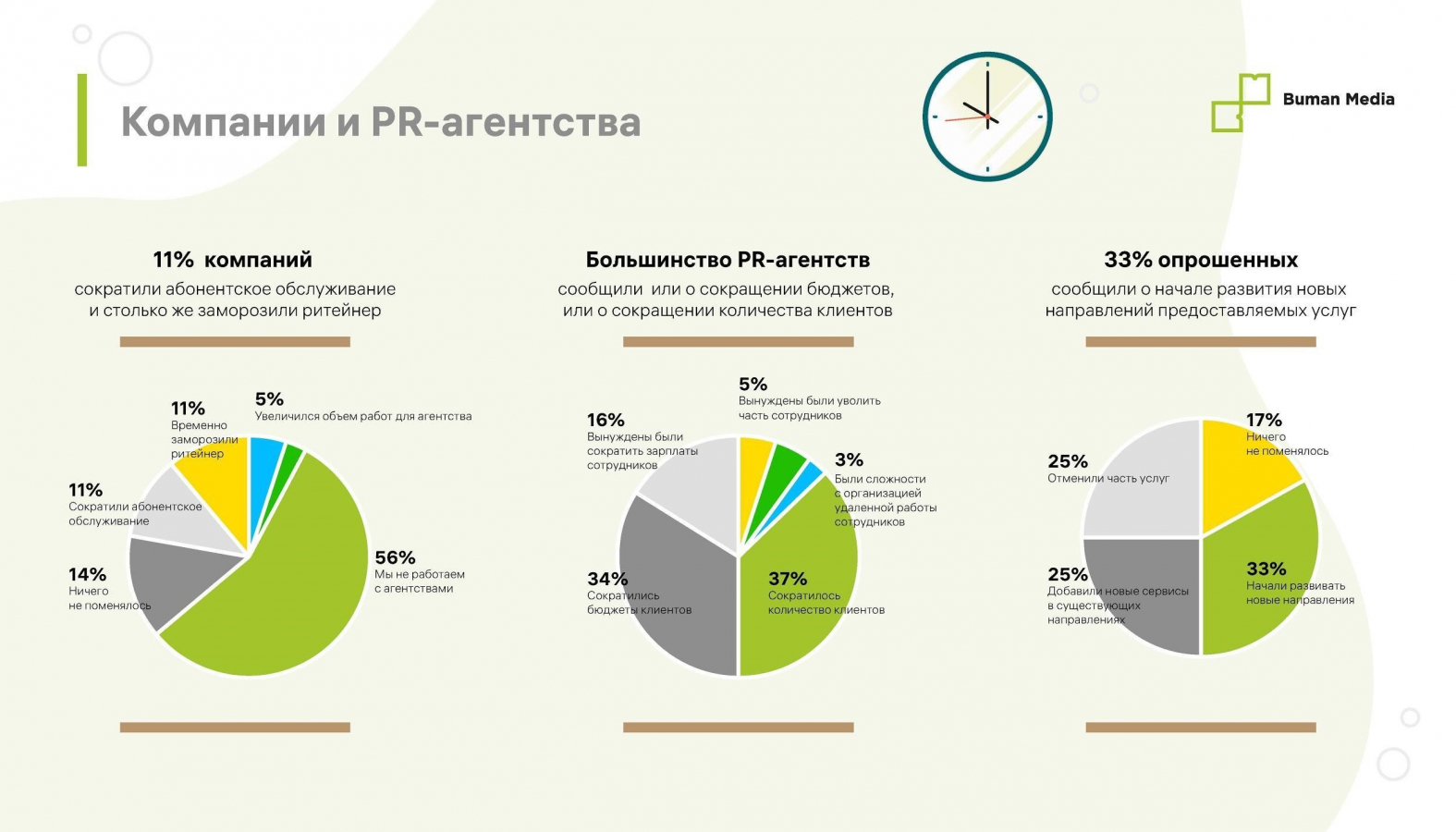 Зарплаты работникам снизили 16% респондентов, еще 5% провели увольнения. В 34% PR-агентств заявили, что у заказчиков сократились бюджеты, а у 37% снизилось количество клиентов.