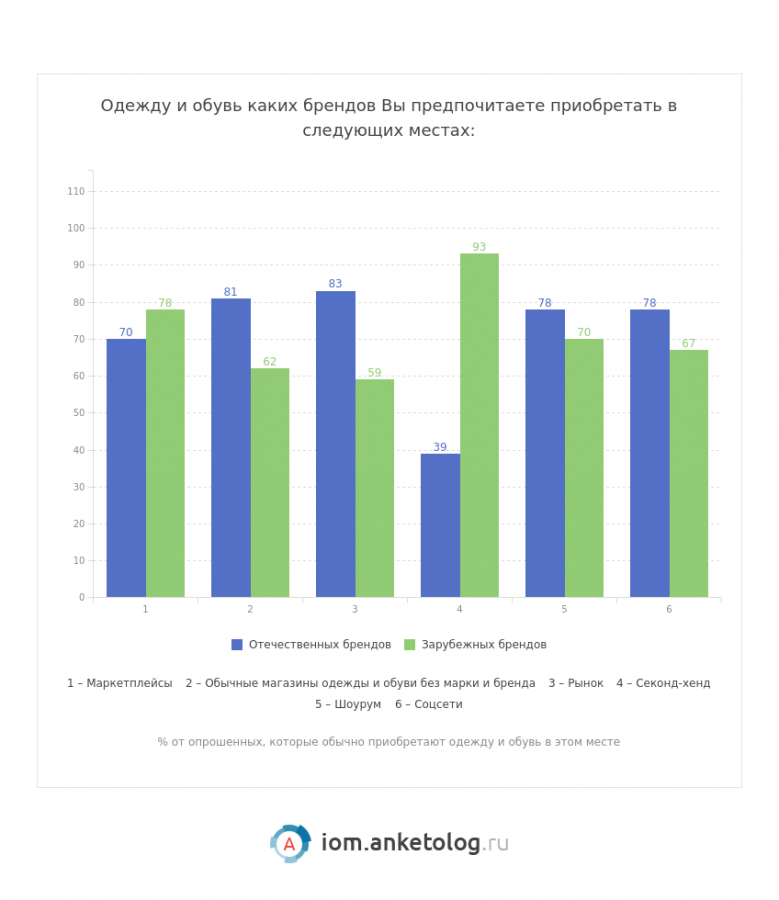 Рынки и шоурумы чаще всего посещают в поисках отечественных брендов. А зарубежную одежду и обувь покупают на маркетплейсах и в секонд-хендах.