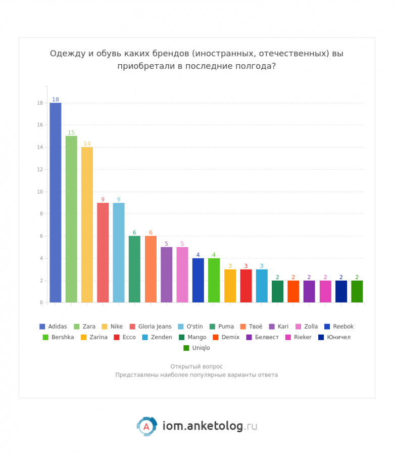 Среди самых покупаемых товаров оказалась одежда покинувших Россию брендов. В тройку лидеров попали Adidas (18%), Zara (15%) и Nike (14%). Российские марки O'stin и Gloria Jeans предпочитают по 9% респондентов, а Puma и «Твоё» по 6%. В десятку вошли бренды Kari, Zolla (по 5%) и Reebok (4%).