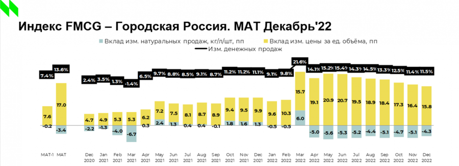 Высокая инфляция стала причиной резкого роста денежных продаж для большинства FMCG-товаров. Наибольший вклад внесли энергетические и спортивные напитки, водка и бренди. Среди основных товарных групп рост показали только натуральные продажи алкоголя (без учёта тихого вина), однако их динамика в штуках замедлилась в пять раз — до 0,7% в 2022 году по сравнению с 3,7% в 2021-м.
