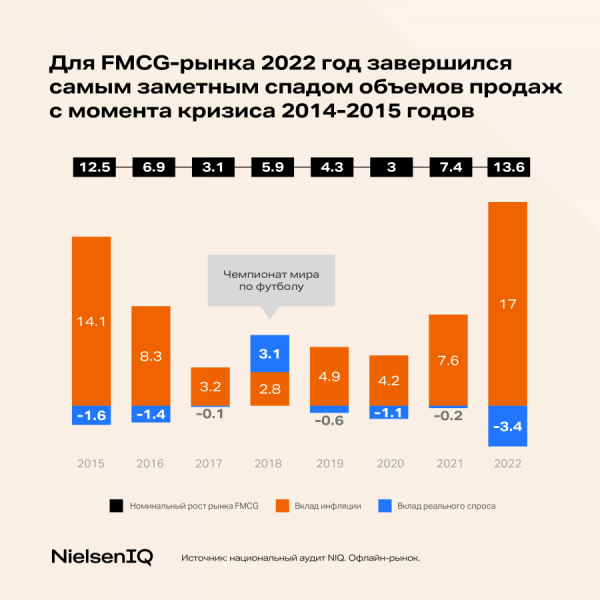 Номинальный рост FMCG-рынка в России в 2022 году составил 13,6%, однако эти цифры обусловлены инфляцией в 17%. Вклад реального потребления снизился на 3,4%. Объёмы продаж FMCG-рынка достигли самых низких показателей с момента кризиса 2014−2015 годов, следует из данных NielsenIQ. Результаты исследования есть в распоряжении Sostav.