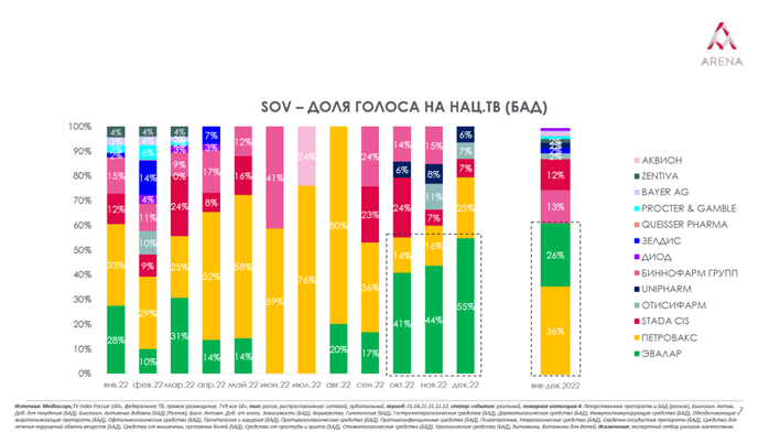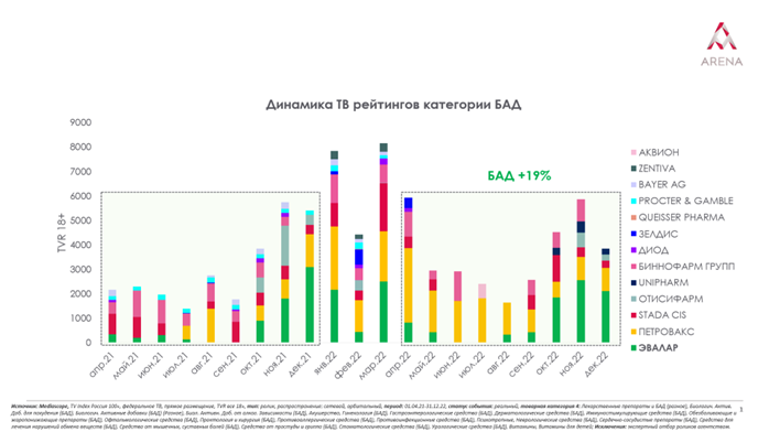 С апреля 2022 года активность производителей БАД на федеральном ТВ выросла на 19%, согласно расчётам Arena на основе данных Mediascope. По итогам последних трех месяцев 2022-го топ-рекламодателем в категории стал «Эвалар» — за весь год компания показала рост на 26%. Также самыми представленными на ТВ стали компании «Петровакс» (на 36%) и «Биннофарм Групп» (на 13%).