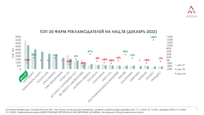 Другие отечественные фармпроизводители также нарастили инвестиции в рекламную поддержку брендов. Так, в декабре 2022 года рекламодатель «Петровакс» показал рост в 11% (в сравнении с 5% в аналогичном периоде прошлого года). Также положительную динамику демонстрируют бренды, которые активизировались после сокращения присутствия зарубежных рекламодателей: «Биннофарм Групп» на 10%, «Полисорб» на 9%, «Отисифарм» на 8%. В конце 2022 года противопростудные препараты и средства для ЖКТ занимали значительную часть топ-20 брендов на ТВ, что обусловлено сезонностью и периодом праздников.