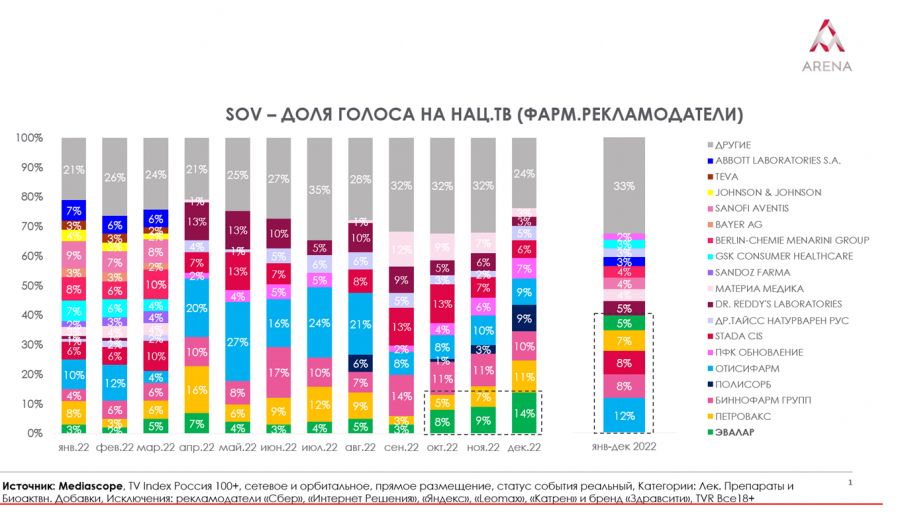 По итогам декабря 2022 года среди всех рекламодателей категории на первом месте оказался российский производитель «Эвалар». Сегодня это один из крупнейших рекламодателей в категории. За весь период компания не только сохранила, но и увеличила объёмы рекламного присутствия на ТВ.