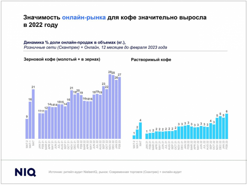 Cуммарная доля интернет-продаж кофе — молотого, в зернах и растворимого — за 12 месяцев до февраля 2023-го выросла до 11,3% в натуральном выражении, подсчитали в NielsenIQ (исследование есть в распоряжении Sostav). За два прошедших года этот показатель утроился с 4%, а по сравнению с 2022-м он вырос на 3,1 процентных пункта.