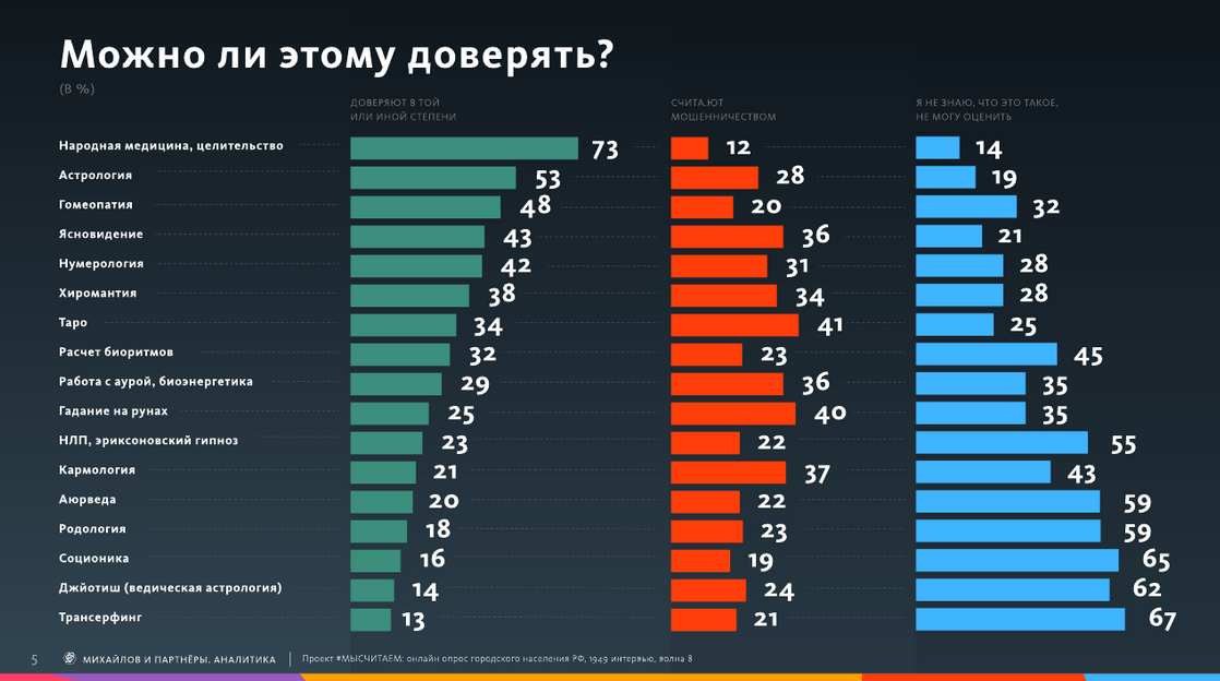 Более всего опрошенные склонны доверять народной медицине (73%), астрологии (53%) и гомеопатии (48%). Различные виды гаданий несколько чаще считаются мошенничеством. Неоднозначно также оценивается ясновидение и работа с аурой.