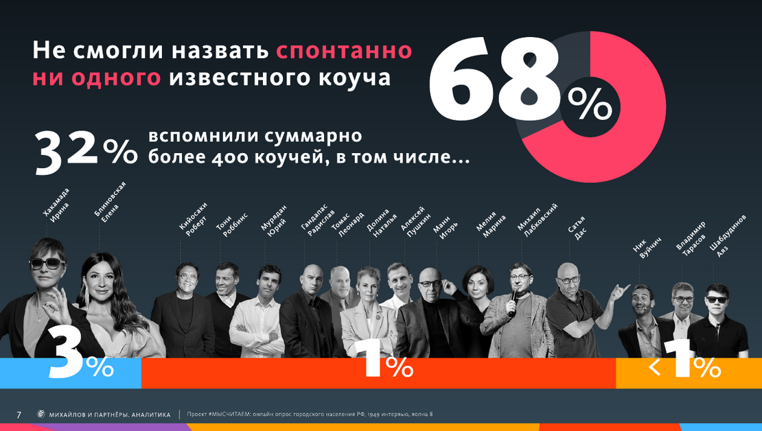 Несмотря на готовность доверить коучам решение многих вопросов, большинство респондентов (68%) спонтанно не может вспомнить никого из специалистов этого профиля. Те же, кто смог назвать конкретные фамилии известных коучей, также не были единодушны — всего было названо более 400 персоналий. Из них относительно часто упоминались Ирина Хакамада и Елена Блиновская — про них спонтанно вспомнили по 3% участников исследования.