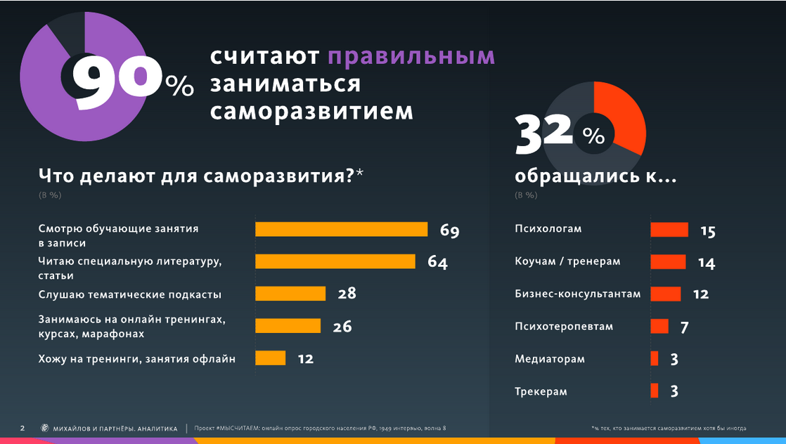 90% респондентов отметили, что саморазвитие — это важная для них ценность, 44% занимаются им регулярно. Основной источник для большинства — это видеоуроки и лекции (69%), специальная литература и статьи (64%). Каждый третий (32%) отметил, что обращался к услугам таких специалистов, как психологи (15%), коучи (14%), бизнес-консультанты (12%). Доля клиентов таких специалистов несколько выше среди молодежи до 34 лет (44%).