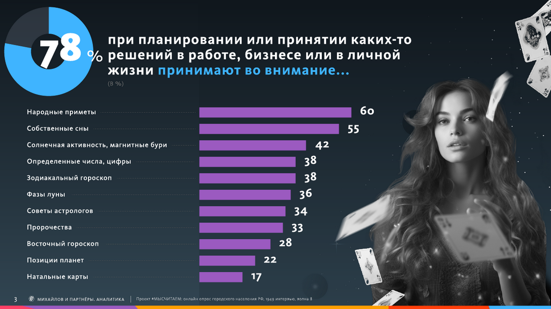 Одновременно участники исследования продемонстрировали достаточно высокий уровень доверия суевериям и эзотерическим учениям. 78% ориентируются на них при планировании или принятии каких-то решений в работе, бизнесе или личной жизни. Более чувствительны ко всем этим явлениям женщины и молодежь до 34 лет.