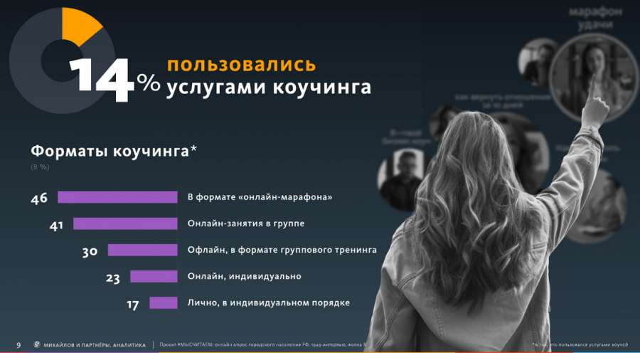 Каждый третий опрошенный обращался к услугам коучей, психологов и бизнес-консультантов: 75% считают, что они могут быть полезны в развитии личностных навыков, 73% — навыков руководителя, а 77% — для повышения мотивации в занятиях спортом. Такие результаты получило агентство «Михайлов и Партнёры. Аналитика» в результате опроса в рамках социологического проекта «#МЫСЧИТАЕМ». Исследование показало большой интерес и доверие россиян к «личностному росту», саморазвитию, эзотерике и нетрадиционным практикам — результаты есть в распоряжении Sostav.