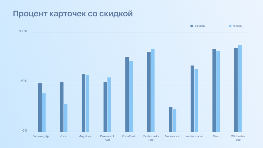 На графике видно, что скидки сильнее всего меняются в сервисах доставки продуктов, тогда как на маркетплейсах из-за объема разница не так заметна. Стоит учитывать, что даже внутри одной площадки скидка сильно варьируется от категории к категории.
