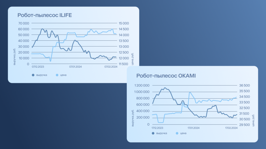 Покупатели на маркетплейсе принимают решение о покупке, отталкиваясь от цены. Например, снижение всего на 15% (в зависимости от категории и платформы) может привести к четырехкратному росту продаж, как видно на графиках ниже на примере категории «роботы-пылесосы».