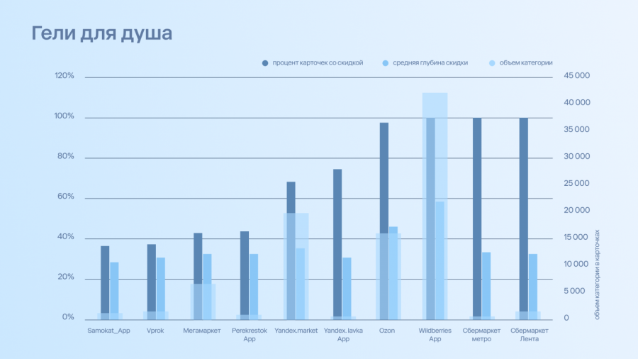 При этом размер скидок сильно варьируется в зависимости от маркетплейса. Например, распределение цен и скидок в категории «гели для душа» на разных платформах выглядит так: