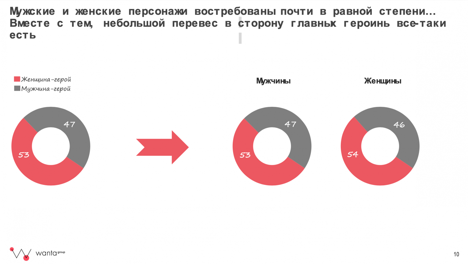Также исследование показало, какой герой наиболее популярен у аудитории. Мужские и женские персонажи востребованы одинаково — важно, чтобы они справлялись с какими-либо трудностями. При этом профессия персонажа может быть любой, но должна соответствовать гендерным стереотипам. Так, например, не очень сработает сюжет про женщину-пилота самолёта.