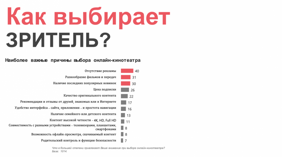 Наиболее важный критерий при выборе онлайн-кинотеатра у зрителей — «отсутствие рекламы», на втором месте — «разнообразие фильмов и передач», на третьем — «наличие последних новинок», на четвертом — цена «подписки». Критерий «качество оригинального контента» занимает лишь пятую строчку, что говорит о смене зрительских приоритетов. Ориджиналсы перестали быть главной причиной для оформления подписки на платформу, считает Мария Щербаль.