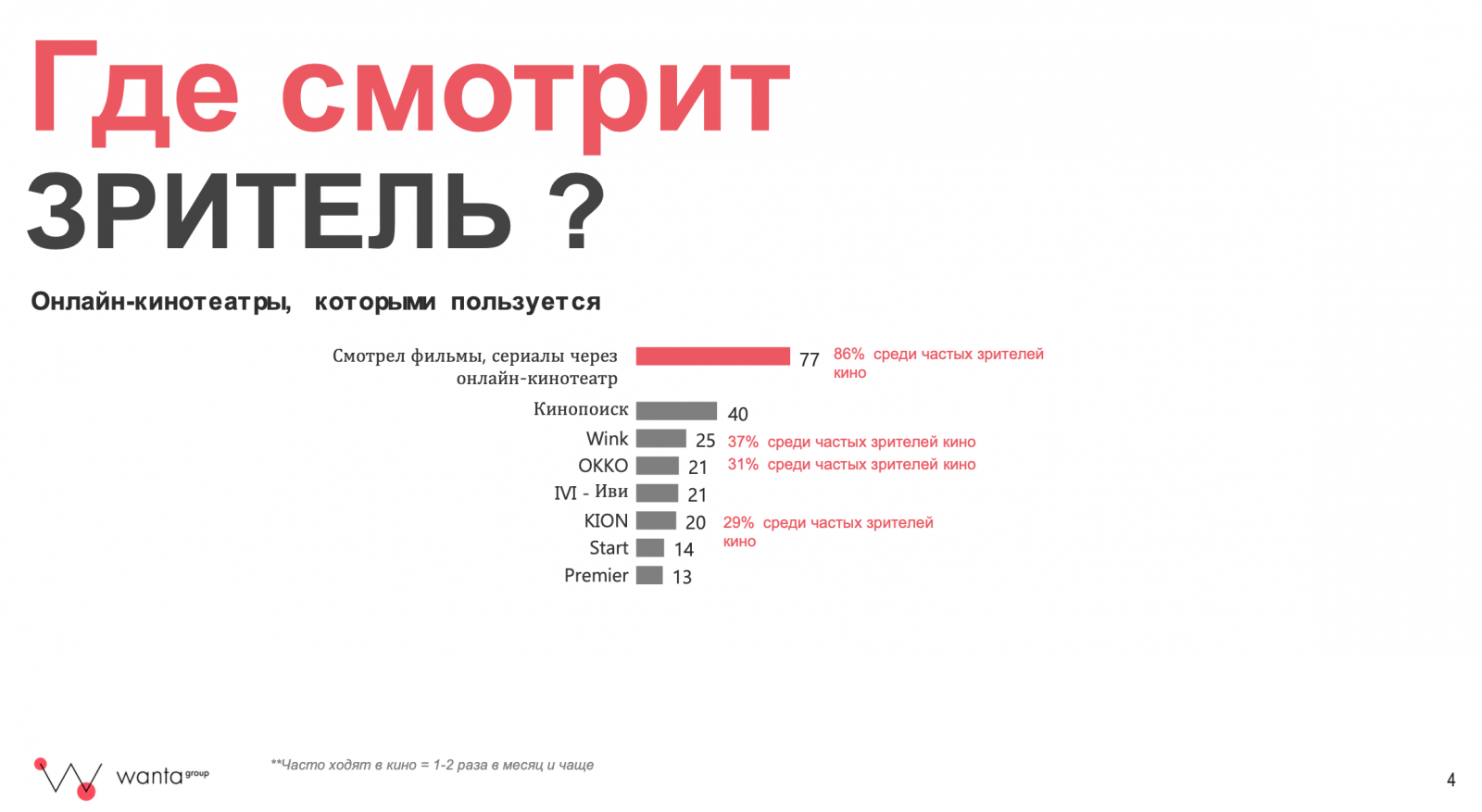Среди всех онлайн-кинотеатров зрители чаще всего оформляют подписку на «Кинопоиск» (40% респондентов). Далее следуют Wink (25%), Okko (21%), «Иви» (21%), Kion (20%), Start (14%) и Premier (13%). При этом онлайн-кинотеатры в середине рейтинга быстро меняют свои позиции в зависимости от контента. Так, на положение Kion сильно влияет появление новых фильмов и сериалов.