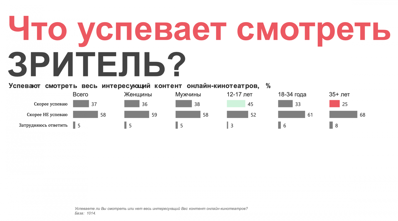 Люди 35+ чаще остальных затруднялись дать оценку по поводу своего отношения к российскому контенту, больше склоняясь к негативному мнению и объясняя его отсутствием интересных премьер. Также именно эта группа чаще остальных не успевает смотреть контент. По мнению Марии Щербаль, негативное отношение к новому российскому контенту может быть связано с отсутствием свободного времени на его просмотр.