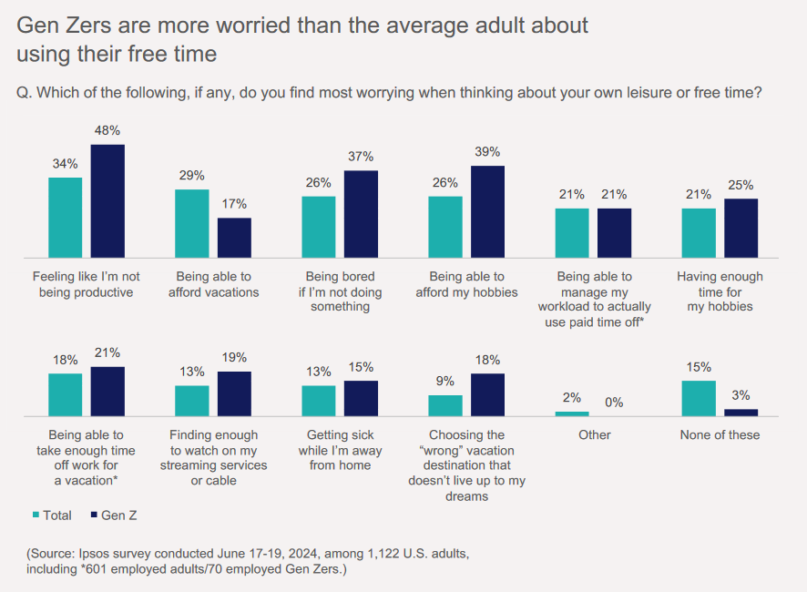 84% опрошенных в США считают, что должны быть продуктивными каждый день. Больше всего от такого убеждения страдают зумеры: половина респондентов этого поколения, если все-таки решает уделить внимание своему досугу и расслабиться, то переживает за впустую потраченное время. Зумеры полагают, что могли бы использовать эти минуты с большей пользой.