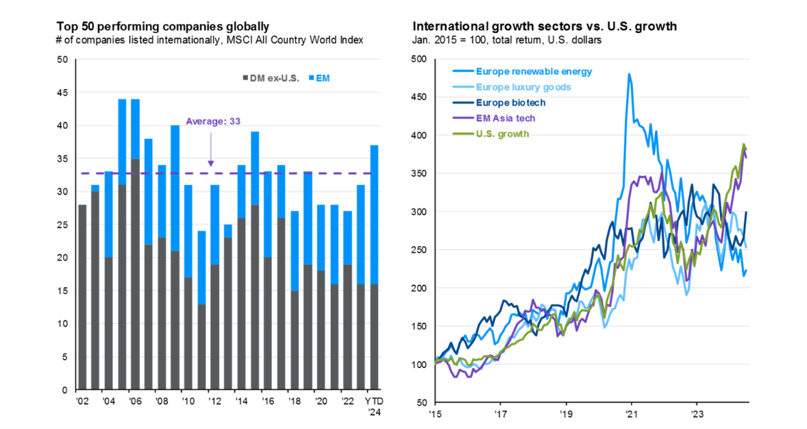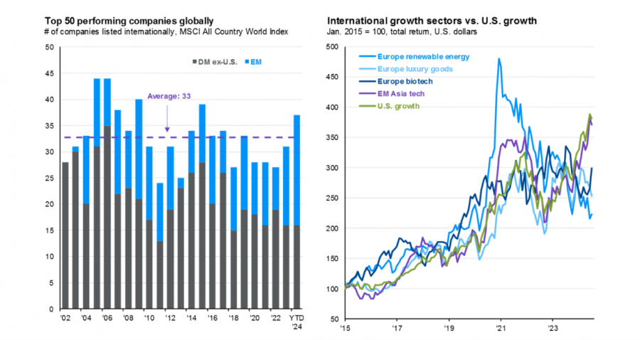 Слева видно, что более половины из 50 компаний, включаемых в индекс MSCI All Country World Index, находятся за пределами США. Если инвесторы игнорируют международные акции, они упускают возможность вложиться в успешные компании по всему миру. Справа показано, что хотя рост фондового рынка обычно ассоциируется с США, в Европе и Азии также есть секторы, которые с 2015 года показывают аналогичный рост.