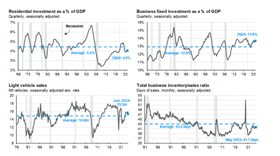 Эта часть посвящена анализу состояния экономики через ключевые циклические секторы, такие как жилищное строительство, инвестиции в основные средства, продажи автомобилей и соотношение запасов к продажам. P.J. Morgan называют их «Четырьмя всадниками рецессии», потому что на этих графиках видно, где может возникнуть экономический пузырь и привести к спаду. Пока что ни один из этих секторов не выглядит перегруженным. Следовательно, если рецессия и произойдет, то будет мягкой.