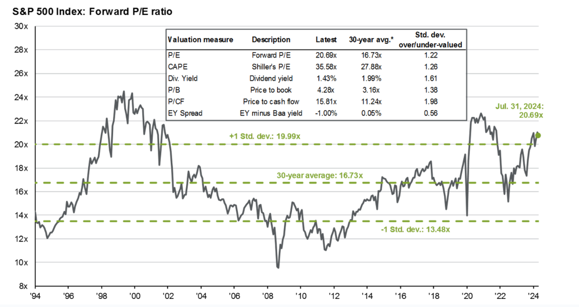 Форвардный коэффициент P/E (цена к прибыли) для S&P 500 рассчитывается как отношение текущей цены индекса к прогнозируемой прибыли компаний в будущем. На данный момент этот коэффициент составляет 21,07, что значительно выше среднего за последние 30 лет (16,7). Это говорит о том, что рынок может быть переоценен на 26%.