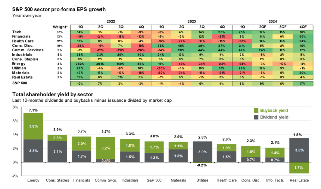 Также представлены данные о росте прибыли, дивидендах и выкупах акций по различным секторам. Многие из них столкнулись с трудностями в 2022 и 2023 годах, однако «информационные технологии» и «потребительские услуги» показали хороший рост прибыли. Ожидается, что к концу года прибыль будет расти и в других сегментах. На нижнем графике видно, как различается доходность акционеров в зависимости от выкупа акций и дивидендов по секторам.