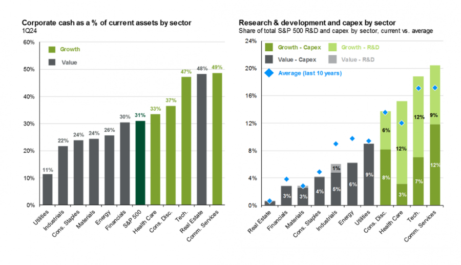 Обычно считается, что растущие компании не держат много наличных денежных средств, однако на графике видно, что многие организации активно инвестируют наличные средсвтва в исследования и разработки (НИОКР), капитальные вложения, чтобы расти и развиваться.