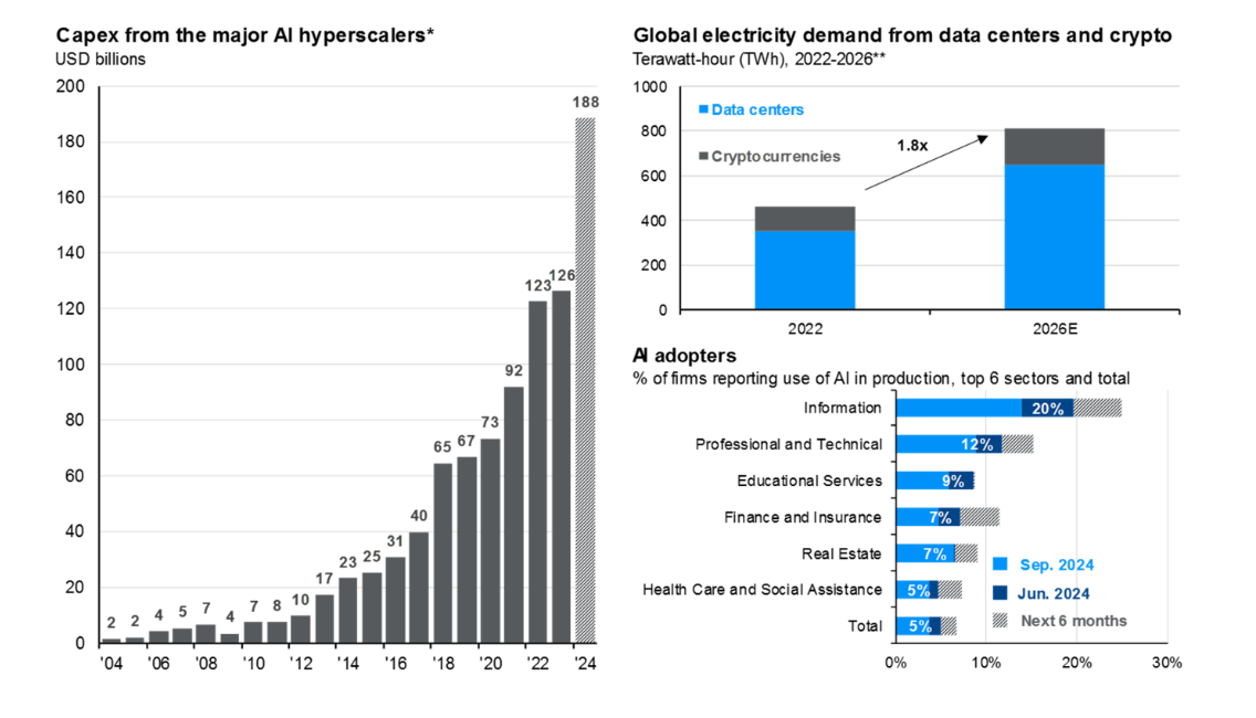 Здесь показан прогресс в области инвестиций в искусственный интеллект. Слева представлены расходы пяти крупнейших компаний по разработке ИИ в США, которые значительно увеличились в последние годы и, по прогнозам, вырастут еще больше в 2024 году. Справа мы видим, что спрос на электроэнергию вырастет из-за необходимости питания центров обработки данных для ИИ. Это потребует увеличения инвестиций в энергосистему. Внизу справа показаны последние тенденции внедрения ИИ в различных отраслях бизнеса — эта технология начинает использоваться не только в IT-сфере.
