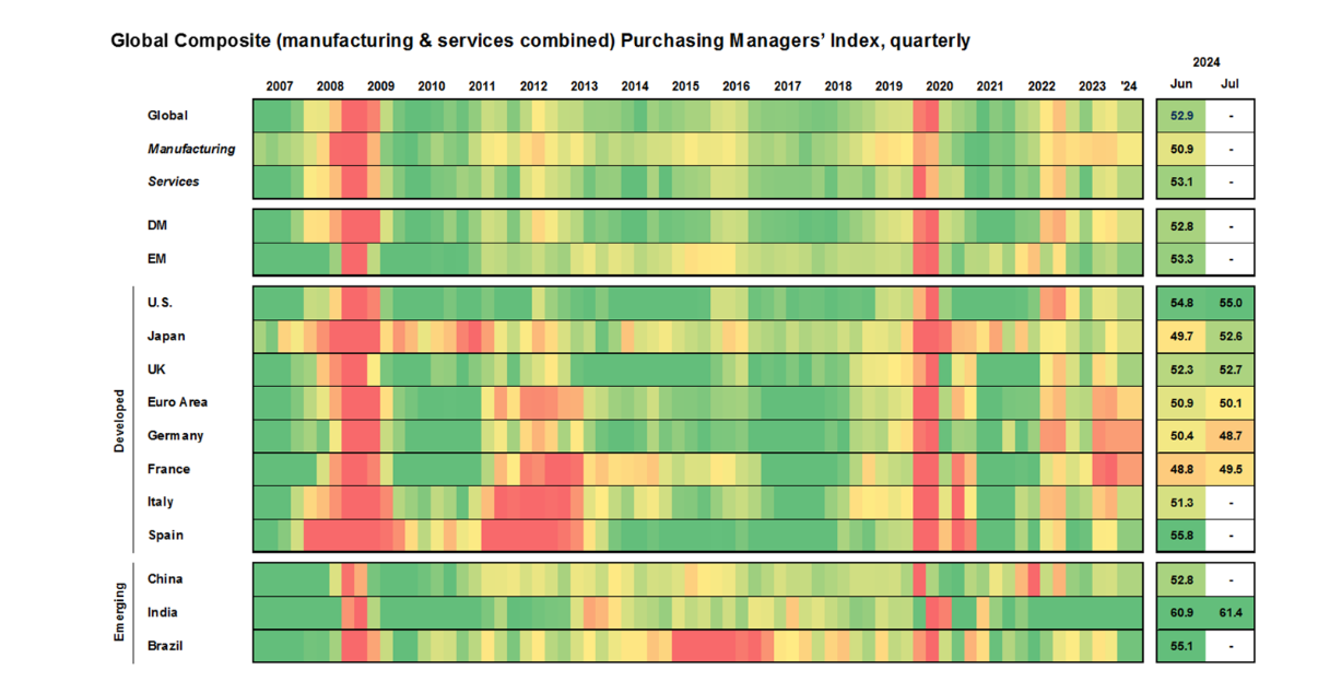В этой главе представлен обзор глобальной экономической активности с помощью индексов менеджеров по закупкам (PMI) разных стран в формате тепловой карты. Индекс PMI включает данные как по производству, так и по услугам. Значение выше 50 указывает на рост экономической активности, а ниже 50 — на ее снижение. Зеленый цвет означает ускорение роста, а красный — замедление. Это хороший индикатор для прогнозирования роста ВВП.