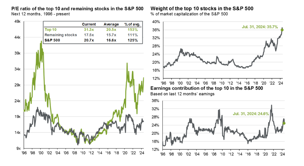 На графиках представлены данные об акциях 10 крупнейших компаний в индексе S&P 500. Сейчас интерес к ним возрос, особенно из-за быстрого развития таких технологий, как искусственный интеллект. Однако рост цен на акции этих компаний не всегда соответствует их фактической прибыли.