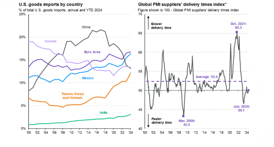 Слева представлены данные по импорту в США по странам. Ранее Китай был основным источником импорта, но теперь также увеличивается доля стран еврозоны, Мексики и Канады. Эти данные помогают отслеживать изменения в цепочках поставок. Справа показан глобальный индекс сроков поставки поставщиков PMI: значение выше 50 указывает на увеличение сроков поставки, а ниже 50 — на их сокращение.