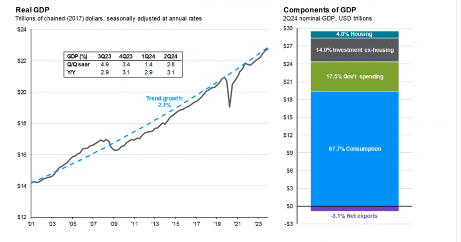 На диаграмме слева показан ВВП США в долларах за последние несколько лет. После быстрого восстановления экономики в 2021 году, когда страна оправилась от пандемии, темпы роста стали более стабильными. Справа представлена разбивка ВВП за последний квартал, где видно, что потребление — это главный двигатель экономики США.