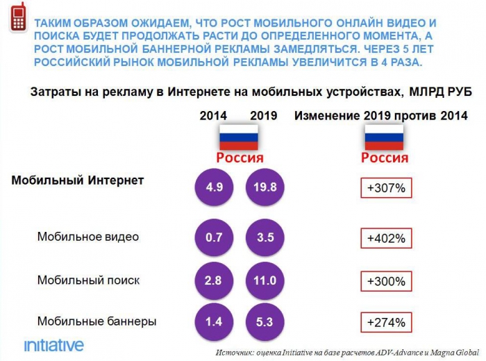 Российский рынок мобильной рекламы растет самыми динамичными темпами на рынке, опережая контекстную и видеорекламу: за 2014 год прирост сегмента составил 59% и его объем достиг почти 5 млрд. рублей. Рост продолжится и далее, несмотря на экономический кризис в стране, и уже к 2019 году объем мобильной рекламы в России вырастет в четыре раза от показателей прошлого года. Об этом говорят данные исследования агентств Initiative и
