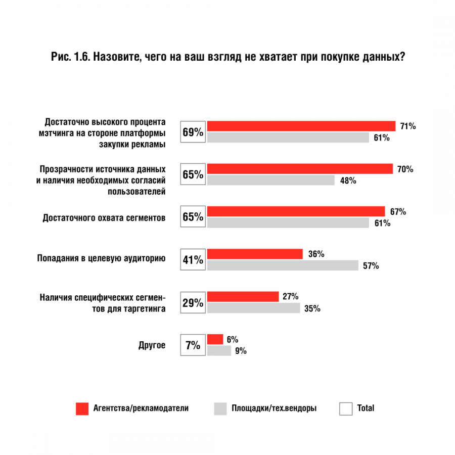 Кроме того, исследователи выявили потребность участников рынка в новых инициативах, которые могли бы повысить эффективность подхода к управлению, основанном на данных (data-driven). Респонденты больше всего ожидают повышения процента мэтчинга на стороне платформы закупки рекламы (69%), увеличения прозрачности источника данных (65%) и новых технологий для достижения достаточного охвата аудиторных сегментов (65%). Среди других актуальных запросов — решение проблемы низкого процента попадания в целевую аудиторию (41%) и создание специфических сегментов для таргетинга (29%).