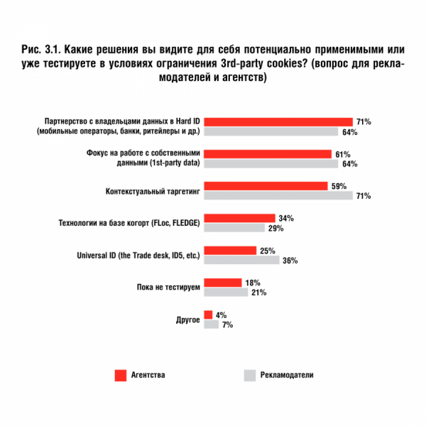 В преддверии cookieless-реальности ключевой точкой роста для агентств и рекламодателей является расширение партнёрства с владельцами данных в твёрдых идентификаторах (71% и 64% соответственно). Эти категории респондентов в том числе сфокусированы на работе с собственными данными (61% и 64%) и использовании контекстуального таргетинга (59% и 71%). В меньшей степени востребованы технологии на базе когорт (34% и 29%) и Universal ID (25% и 36%).