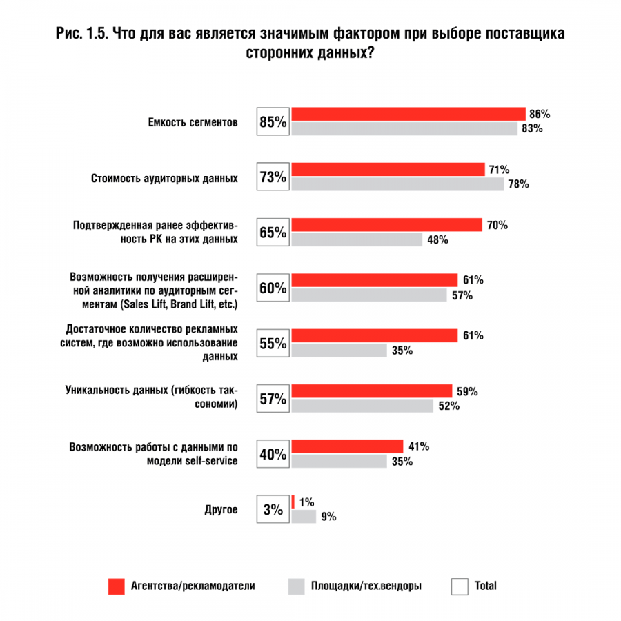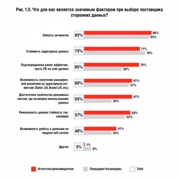 Главными факторами при выборе поставщиков данных являются емкость сегментов (85%), стоимость аудиторных данных (73%) и подтвержденная ранее эффективность рекламной кампании (65%). Также 60% игроков учитывают такие критерии, как возможность проведения Sales Lift и Brand Lift исследований, 57% — уникальность данных и достаточное количество рекламных систем, где могут использоваться данные (55%). Для 40% опрошенных важно иметь возможность самостоятельной работы с данными, что свидетельствует о росте собственной экспертизы рекламодателей и агентств.