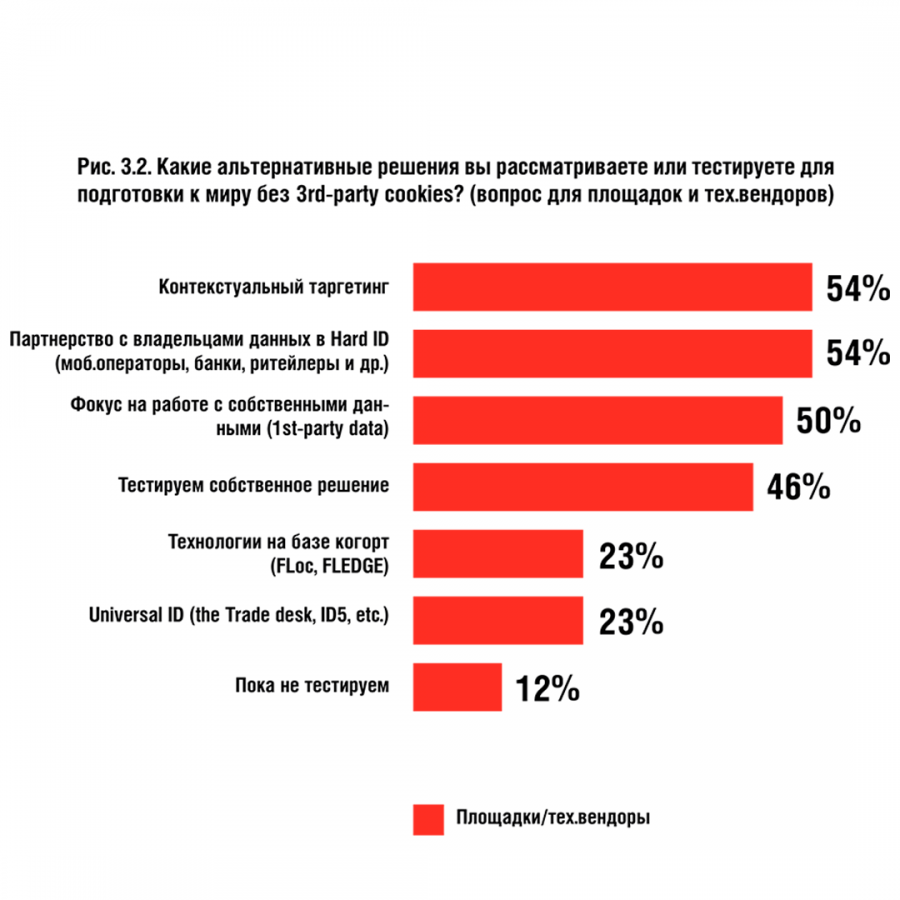 Площадки же в качестве приоритетов рассматривают контекстуальный таргетинг (54%) и поиск партнеров для работы с Hard ID (54%). И одновременно с этим 50% делают акцент на работе с 1st-party data (данные клиентов или аудитории, собранные самостоятельно — прим. Sostav), а 46% тестируют собственные решения.