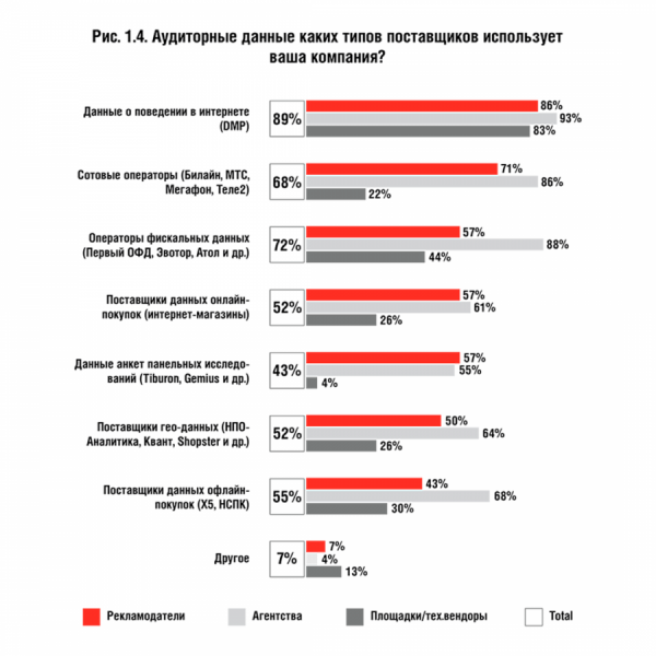 Для решения бизнес-задач участники рекламного рынка активно инвестировали в работу с данными DMP-поставщиков (89%), операторов фискальных данных (72%), сотовых операторов (68%) и интернет-магазинов (52%). При этом среди рекламодателей и рекламных агентств использование поведенческих данных от DMP-поставщиков увеличилось на 28%, данных сотовых операторов — на 33%, данных ОФД — на 53%. Доля использования данных об офлайн-покупках также существенно возросла — на 40%.
