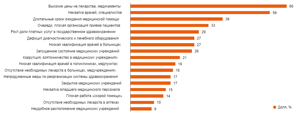 36% опрошенных заявили о том, что за последнее время положение дел в сфере здравоохранения только ухудшилось. Ещё одной острой проблемой респонденты называют нехватку специалистов. Далее, с большим отрывом, следуют такие проблемы, как долгое ожидание медицинской помощи, очереди, плохая организация приёма пациентов в поликлиниках и больницах. Почти треть опрошенных считают проблемой рост доли платных услуг в государственном здравоохранении. Не ускользнуло от взора россиян и нехватка медицинских кадров, плохое отношение персонала к пациентам, закрытие больниц, поликлиник, их отдаленность, а также сокращение койко-мест.