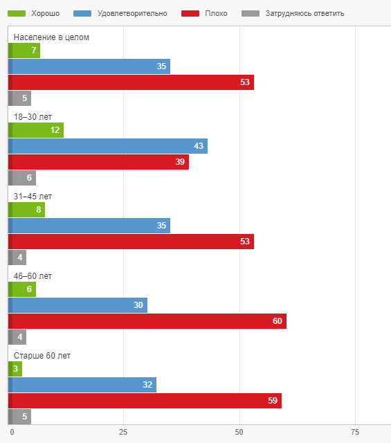 Обратной точки зрения придерживаются 14% граждан. Доля довольных здравоохранением с каждым годом снижается. Среди положительных моментов респонденты отмечают оснащение поликлиник, установку нового медицинского оборудования, ремонт и строительство больниц и поликлиник, а также более внимательное отношение к пациентам со стороны медперсонала.