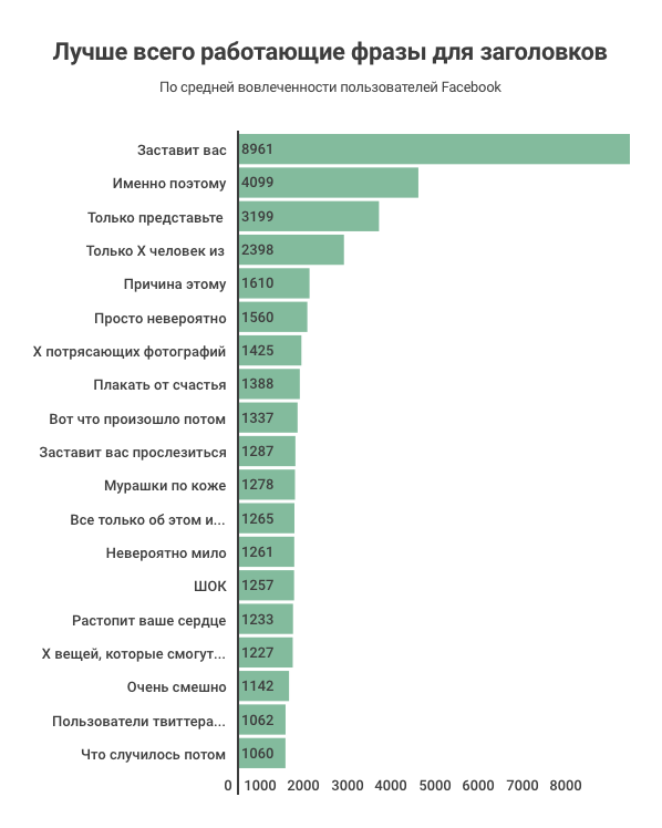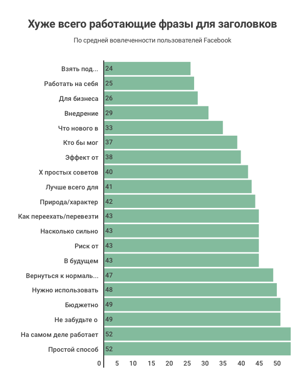 - Наименее же виральными заголовками для Facebook стали фразы "Взять под", "Работать на себя", "Для бизнеса", "Внедрение".