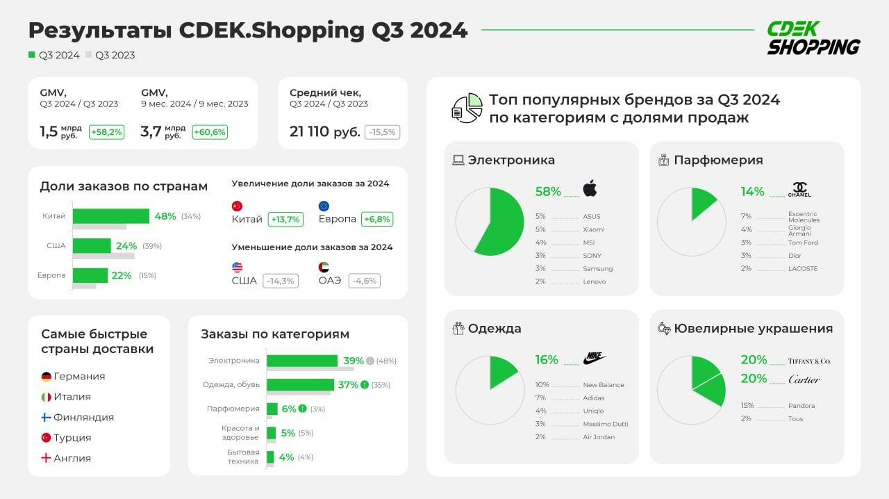 В третьем квартале расходы россиян на импортные товары выросли на 58,2% год к году, до 1,5 млрд руб. Средний чек снизился на 15%, до 21,1 тыс. руб. Наиболее востребованной категорией продукции стала электроника. Таковы данные сервиса CDEK.Shopping, которые есть в распоряжении Sostav.