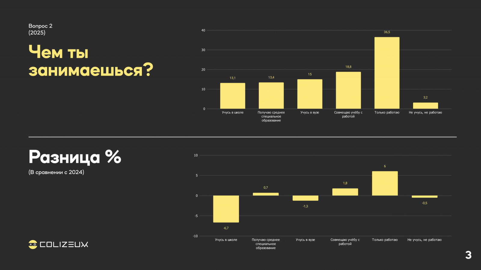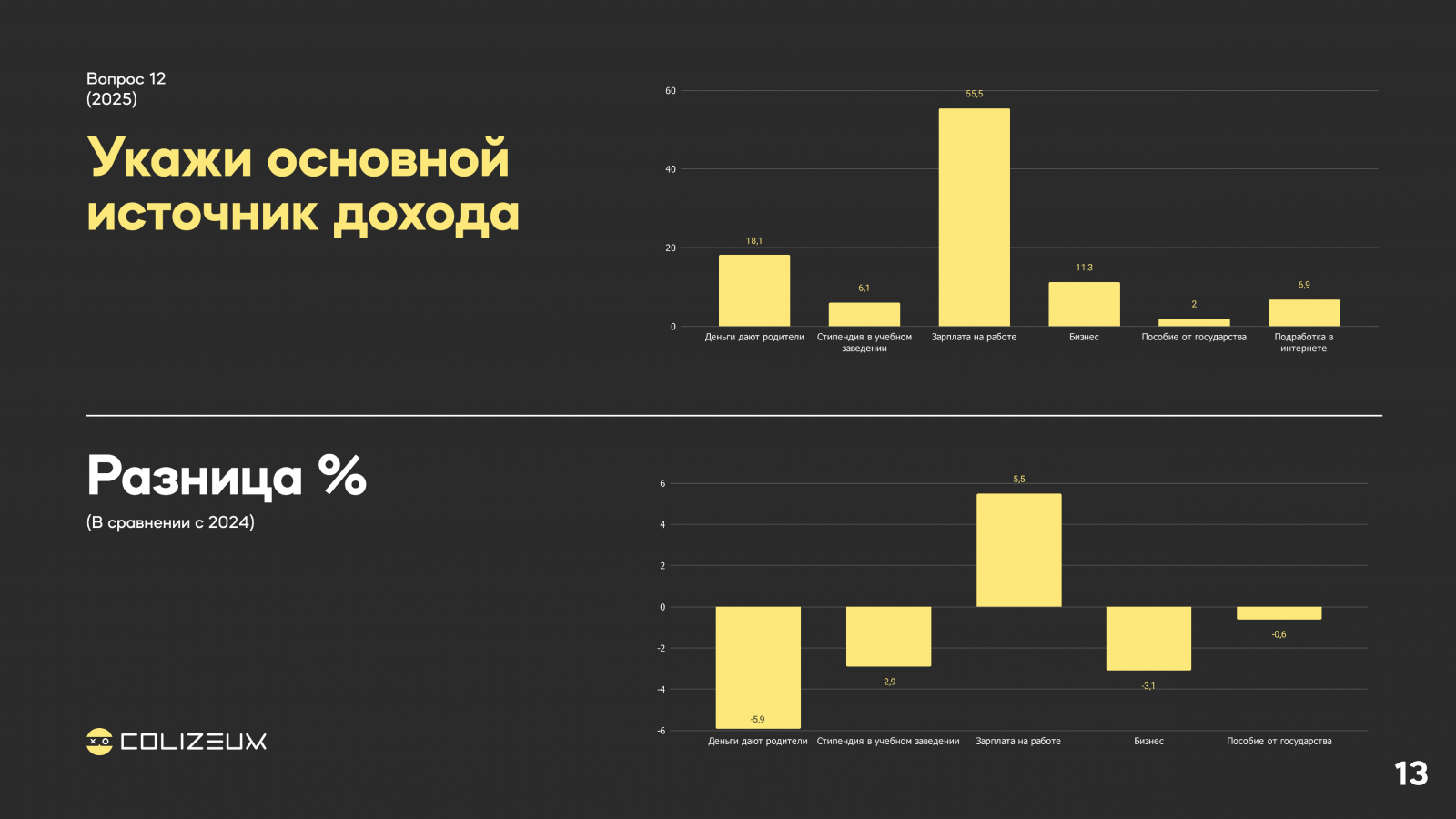 С каждым годом аудитория компьютерных клубов взрослеет. В COLIZEUM уменьшается число школьников и увеличивается количество взрослых, финансово независимых гостей от 18 до 30 лет. По сравнению с 2024 годом доля работающих геймеров выросла на 7,8%. 55,5% опрошенных назвали зарплату на работе основным источником дохода, и только 18,1% посетителей находятся на полном финансировании родителей.